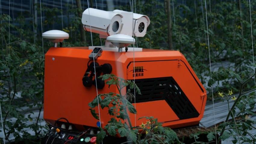 金美科林(湖北)科技股份有限公司关庙集基地负责人代信一说:“这个大棚种植的是圣女果,目前还处于开花阶段。这台机器每天在大棚内进行巡检,观察植株的病虫害情况。”