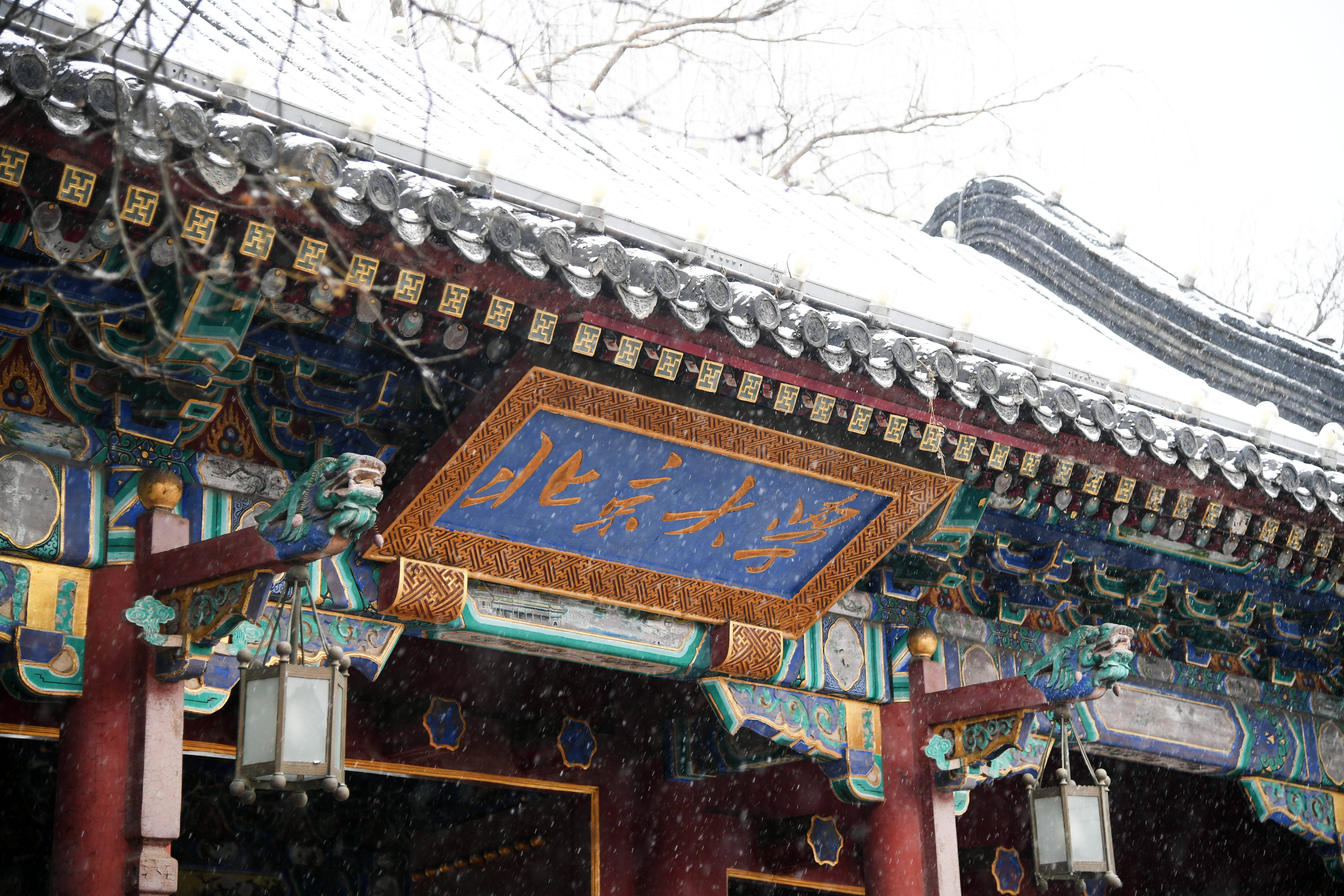 12月12日拍摄的雪中北京大学西门一景。新华社记者 任超 摄冬日限定的雪景