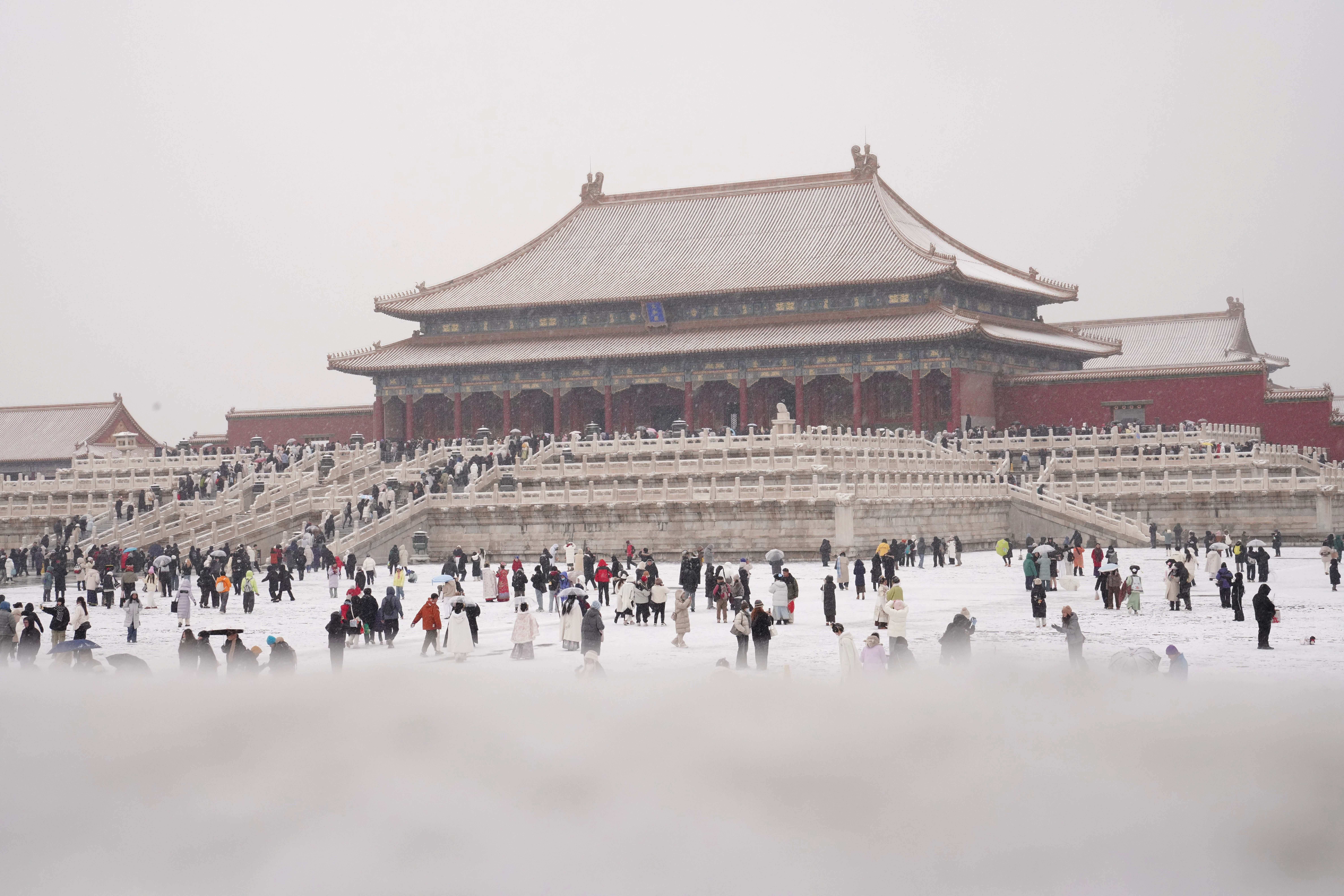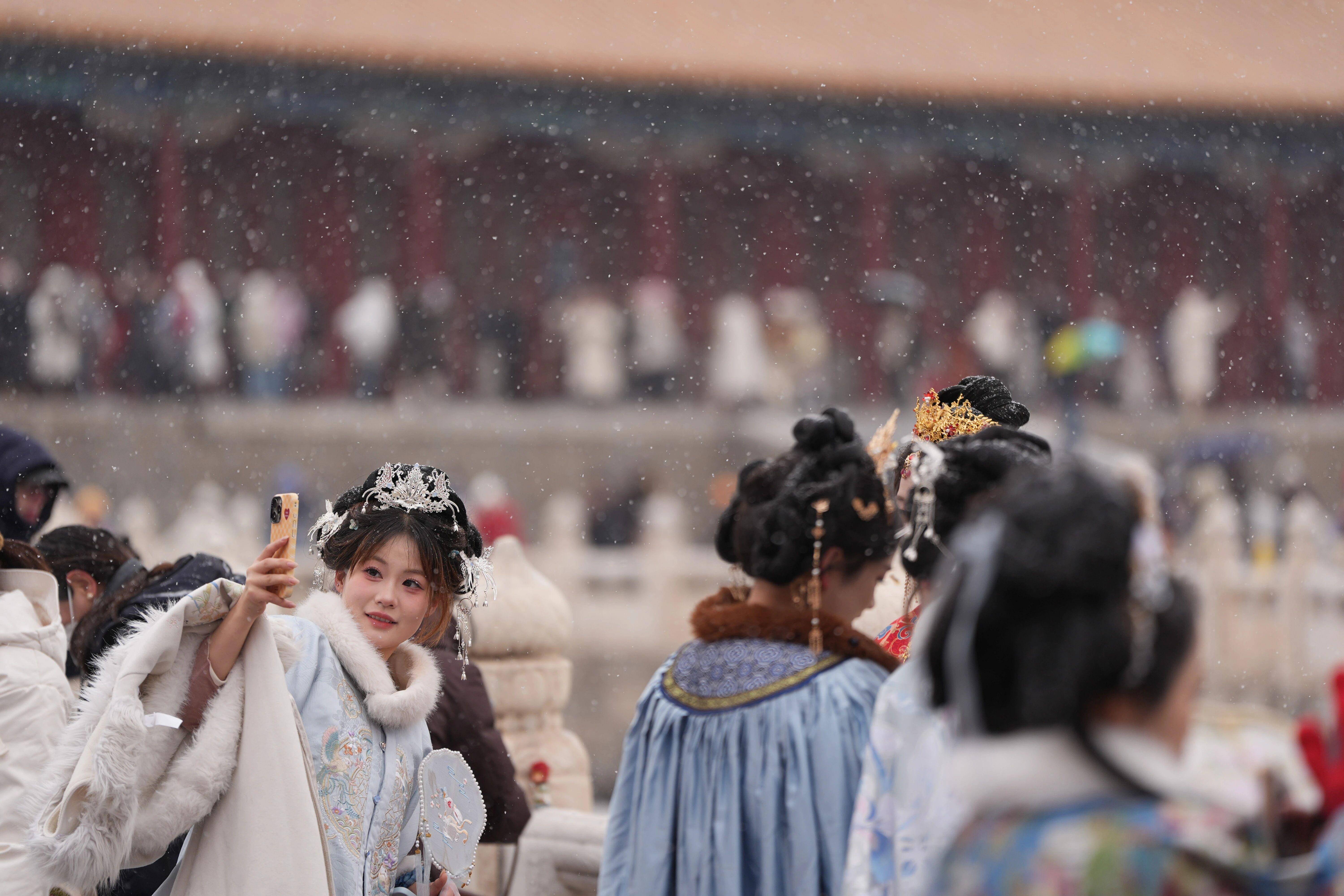 12月12日,游客在北京故宫赏雪拍照。新华社记者 李鑫 摄↓天坛游人如织