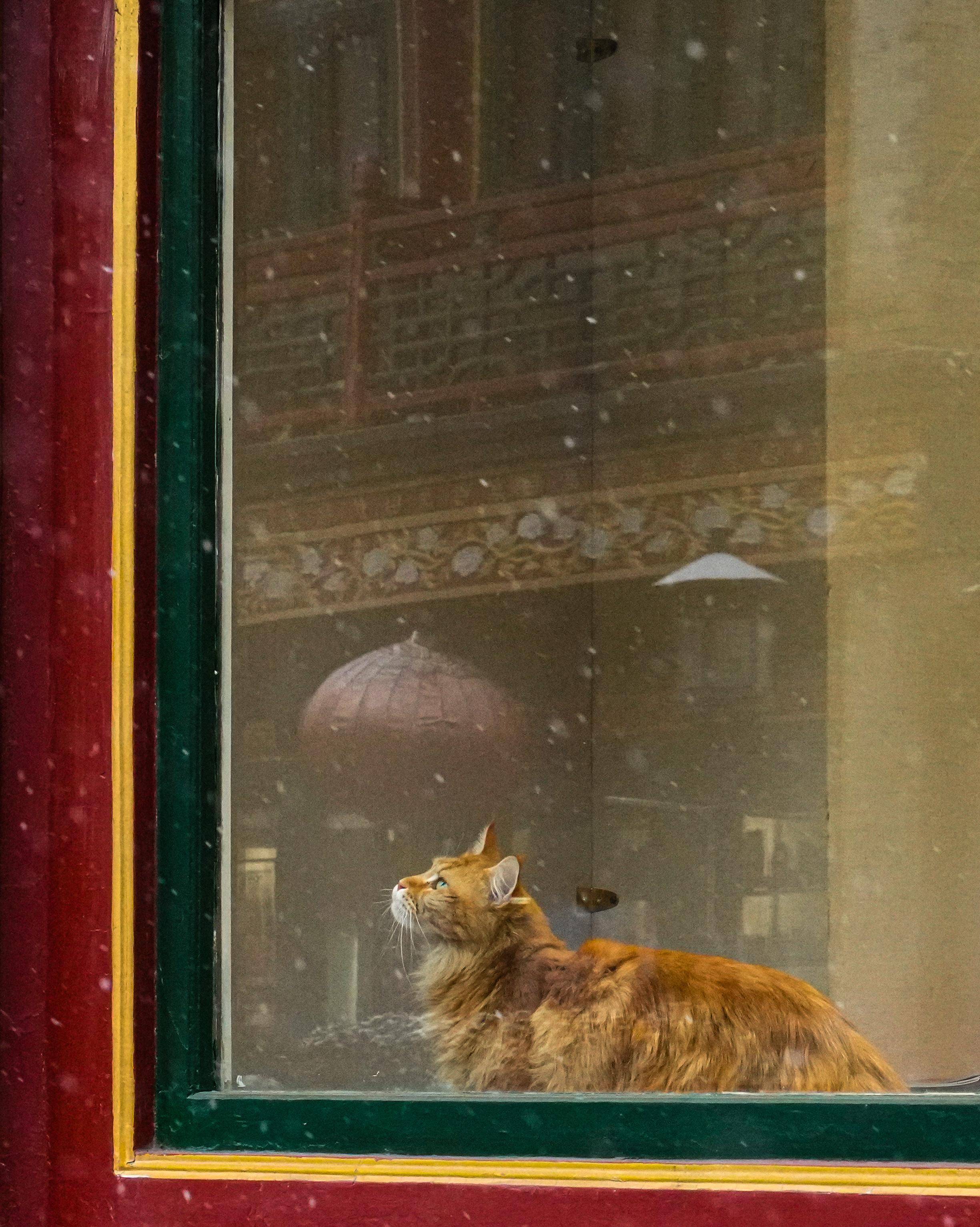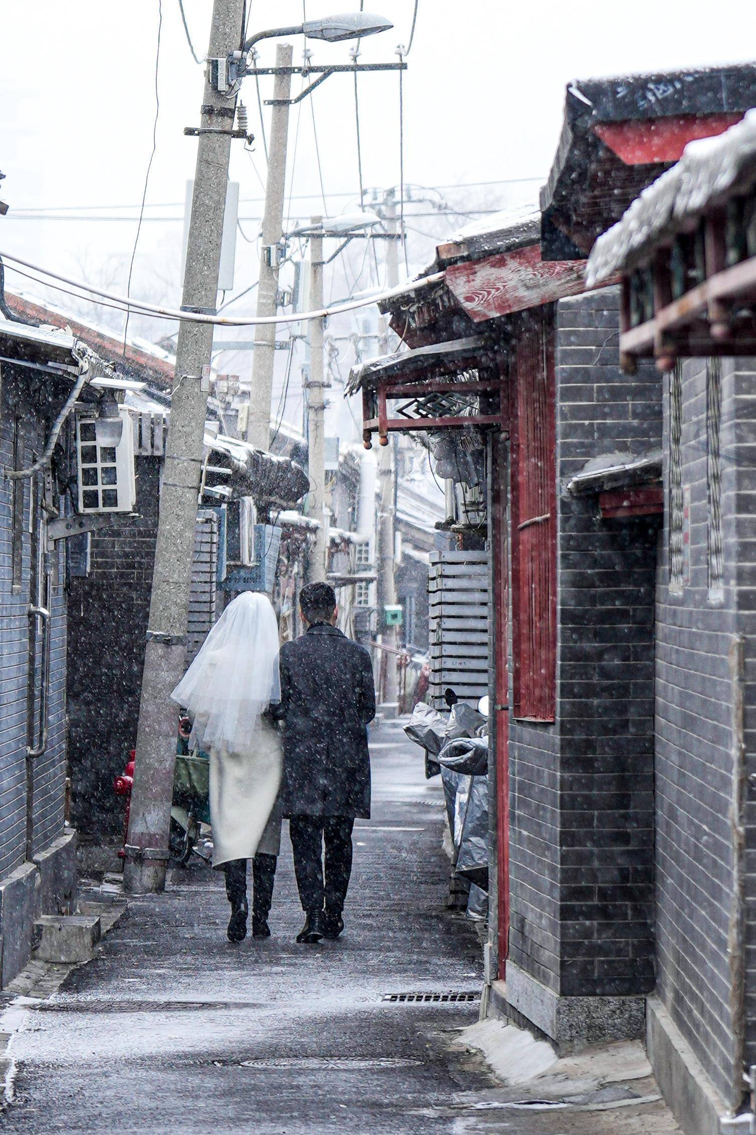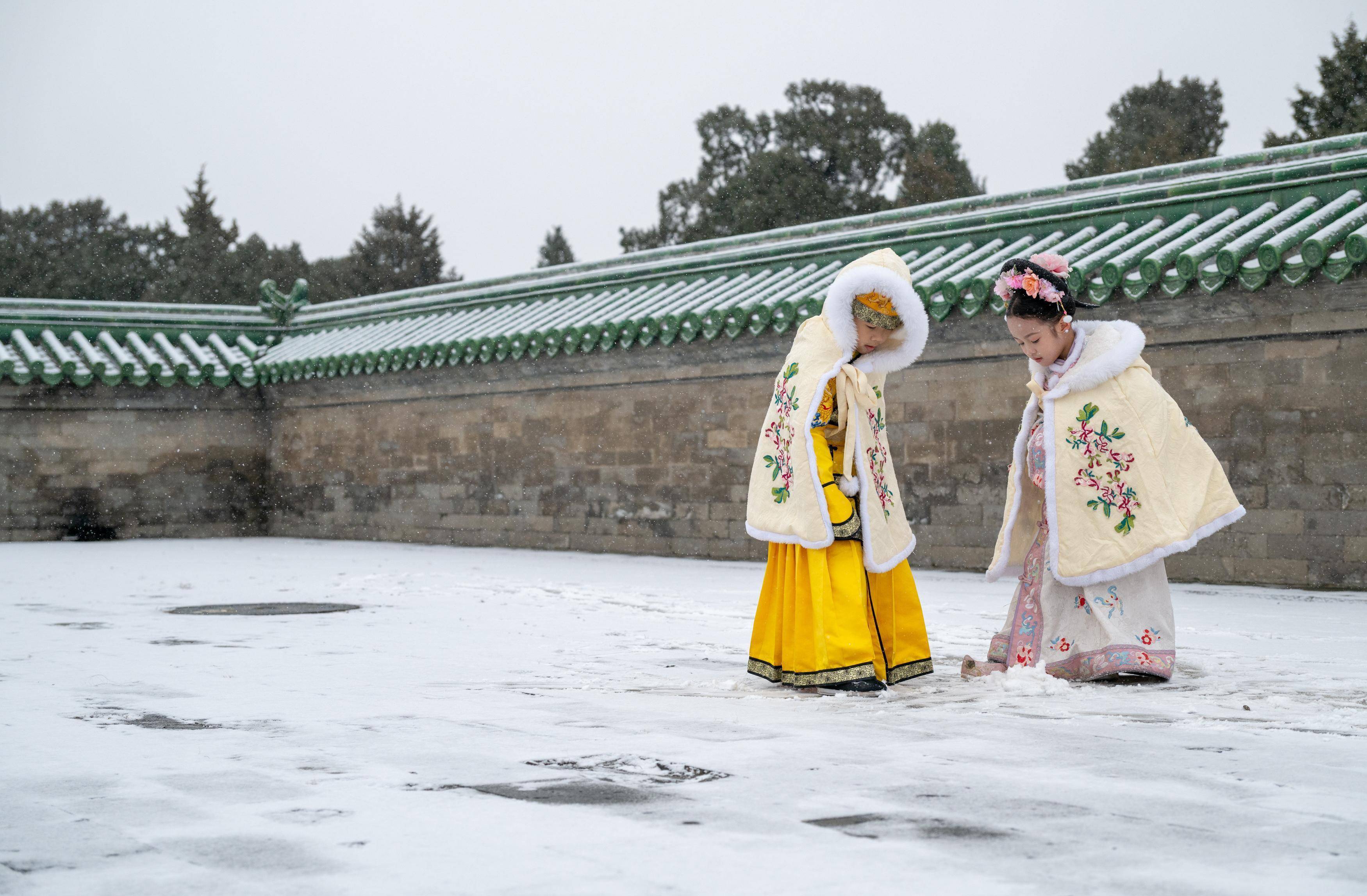 12月12日,两名小朋友在北京天坛公园冒雪游玩。新华社记者 胡竞文 摄↓街头巷尾电影感拉满