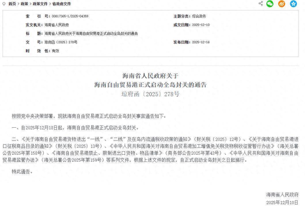 通告称,自2025年12月18日起,海南自由贸易港正式启动全岛封关。